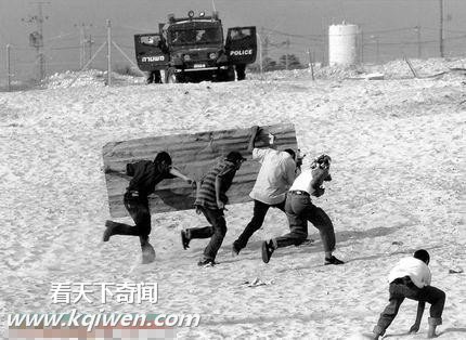 几个巴勒斯坦青年抬着一张破铁皮充当的临时盾牌从以色列军警的汽车前跑过。画面右下角的青年试图捡起一块石头攻击对方。破铁皮、石块,巴勒斯坦人用这样的装备对抗全副武装的以色列军警。双方悬殊的实力对比在这一瞬间得到体现。